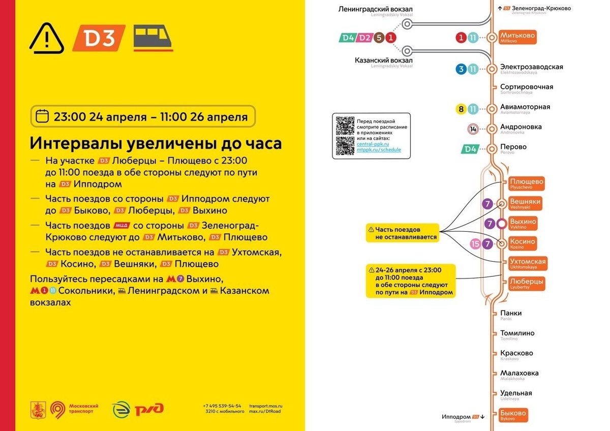 После 23:00 24 апреля до 11:00 25 апреля и в этот же временной период 25 и 26 апреля: На Казанском направлении На участке Люберцы — Плющево интервалы движения будут частично увеличены до 1 часа, поезда в обе стороны проследуют по одному пути «на Ипподром/в область» На участках Митьково — Плющево и Люберцы — Ипподром интервалы будут увеличены до 40 минут Большая часть поездов со стороны Ипподрома проследует укороченными маршрутами до и от станций Быково, Люберцы и Выхино У некоторых поездов скорректированы время отправления и набор остановок — часть составов не остановятся на станциях Косино, Плющево, Ухтомская и Вешняки Часть поездов проследует по соседним путям по тарифу МЦД с остановками на станциях Раменское, Отдых, Люберцы, Выхино, Перово, Андроновка, Авиамоторная и Казанский вокзал На Ленинградском направлении Интервалы движения будут увеличены до 40 минут Часть диаметральных поездов со стороны Зеленограда-Крюково проследует до станций Митьково и Плющево На станциях Отдых, Лю