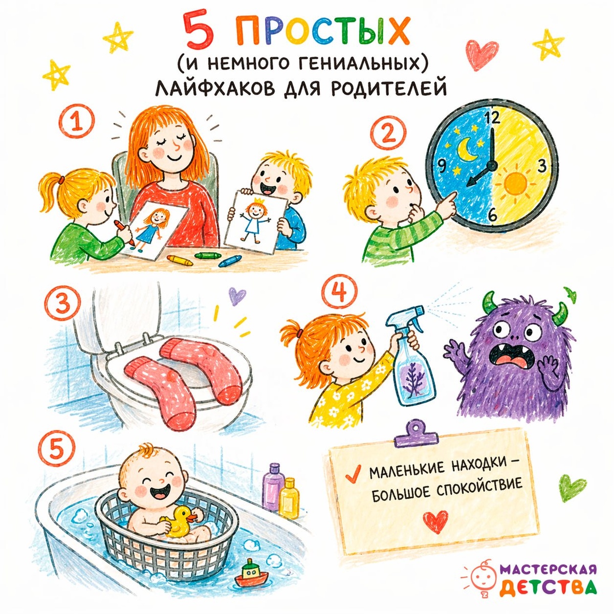 Небольшое предупреждение: пост носит скорее развлекательный характер 🥡 но, как показывает практика, кое-что из этого действительно работает. Иногда всё держится на мелочах. И именно они неожиданно облегчают день. Собрали для вас несколько находок из жизни: 1️⃣ Хотите отдохнуть днём? Станьте «моделью» 🎨 Предложите детям вас рисовать – кто лучше нарисует, получит приз. Проверено: тишина гарантирована. 2️⃣ Ранние подъёмы? Есть решение! Разделите циферблат часов на зоны: «ещё спим» и «уже можно вставать». Ребёнок смотрит и не идёт будить вас в 5 утра (ну… почти). 3️⃣ Тёплый туалет ночью Наденьте носки на сиденье 😄 Мелочь, но ночью – уровень заботы «люкс». 4️⃣ Спрей от монстров Пульверизатор + вода + капля лаванды = официальное средство от всех «бабаек». Иногда работает лучше логики. 5️⃣ Купание без детской ванночки Обычная бельевая корзина в большой ванне – и малыш в безопасности, и вам удобно. 📌 Итог Такие решения не требуют усилий, но заметно упрощают повседневные ситуации.