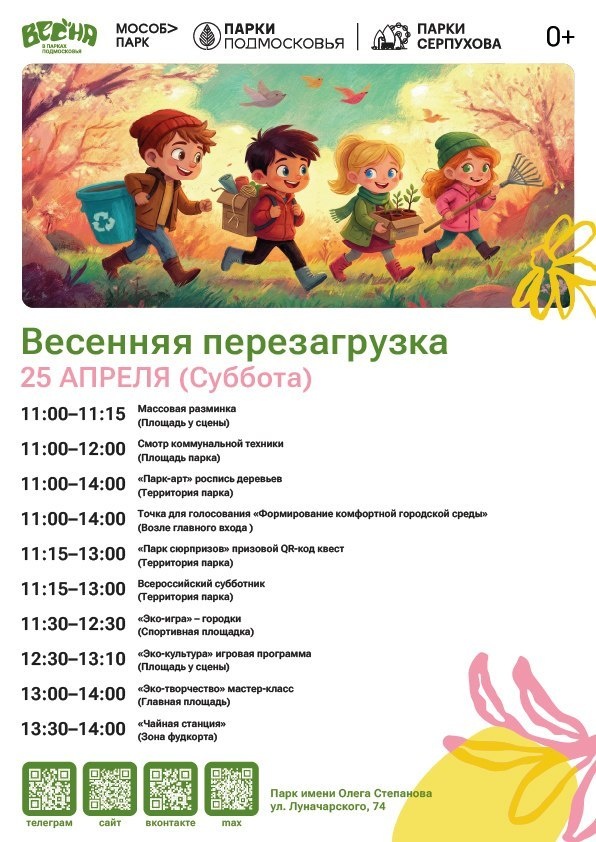 ✨ Весенняя перезагрузка в парке☀️ Что будет: 🌳 Роспись деревьев «Парк – арт» 💪🏼 Массовая разминка 🚜 Смотр коммунальной техники 🤩 Призовой квест «Парк сюрпризов» 🧹 Всероссийский субботник 🧩 Городки «Эко игра» 👶🏼 Игровая программа «Эко культура» 👐🏼 Мастер – класс «Эко – творчество» ☕️ Чайная станция До встречи в парке! 🚫 Возраст: 0+ 📆 25.04.2026 🕒 11:00 🏢 Парк им.Олега Степанова 📍 г. Серпухов, ул. Луначарского, д.74 💰 Вход свободный❗️ ⭐Поддержать канал голосом 💰 Канал Вакансии Серпухова ✅ Мероприятия Серпухов https://dzen.ru/id/66f01c6eb4c6fe60c9ca1608 https://vk.ru/serpukhov_events http://dzen.ru/serpukhov_events