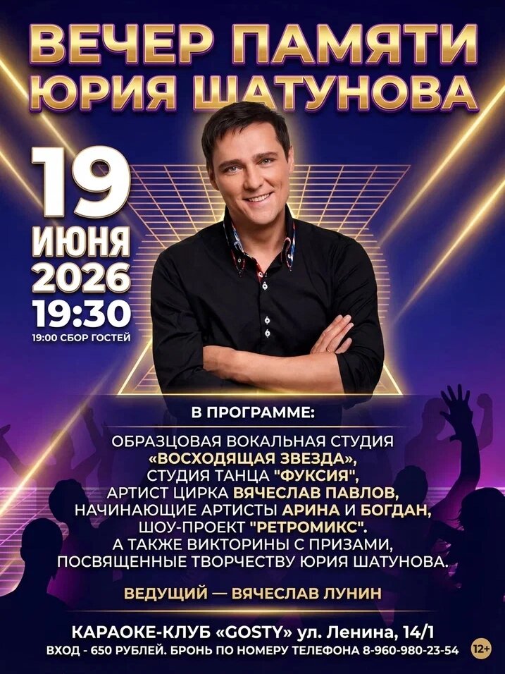 Дорогие друзья, особенно Омичи! 19 июня 2026 года в караоке-баре "Gosty" состоится Вечер памяти Юрия Шатунова, посвященный четвёртой годовщине его ухода. Начало мероприятия в 19.30. Сбор гостей - в 19.00.