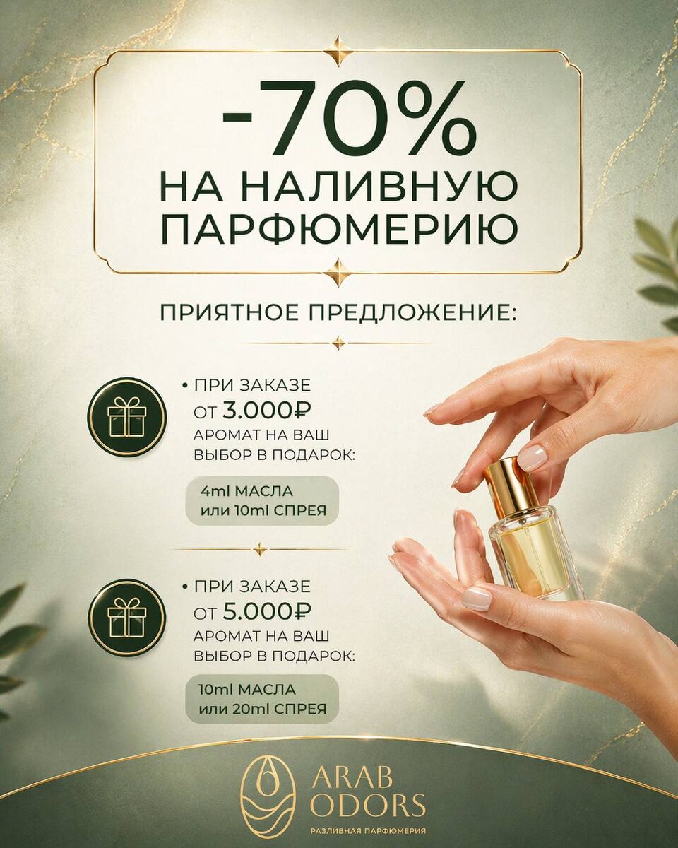 Работаем по актуальному прайсу — сейчас это самые выгодные условия на наш ассортимент. 🕰 Предложение действует до 30 апреля (включительно) ⸻ 🎁 Бонусы за заказ: — от 3 000 ₽ — 10 мл спрей в подарок — от 5 000 ₽ — 20 мл спрей на ваш выбор ⸻ 💚 Весь ассортимент: Подробности в Telegram 👇 👉 arabodors ⸻ 📦 Доставка: • Ozon / СДЭК / Почта — бесплатно от 5 000 ₽ (до 5 000 ₽ — 400 ₽) • По Москве курьером — 500–1 000 ₽ (в зависимости от адреса) • Удалённые регионы — рассчитывается индивидуально 📲 Оформление заказа и консультация: • WhatsApp: https://wa.me/message/XLYW7QDJSHQOJ1 • TG — всегда на связи t.me/+79689790009
