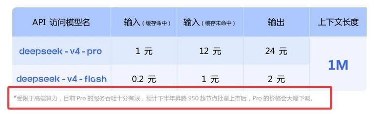 На сайте под таблицей указано, что из-за ограничений в вычислительных мощностях текущая пропускная способность сервиса DeepSeek V4 Pro весьма ограничена. Ожидается, что после запуска Ascend 950 — GPU от Huawei — во второй половине года цена на DeepSeek V4 Pro значительно снизится. https://dzen.ru/id/5c0e38ff46ef5c00aaa80527