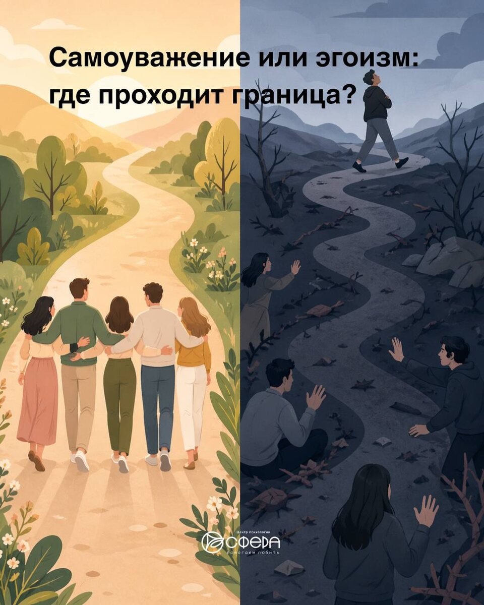 С популярностью психологии люди стали часто путать понятия самоуважения и эгоизма, хотя между ними пропасть. 😬Чем они отличаются и почему одно ведёт к гармонии, а другое к одиночеству. Самоуважение — баланс: «Я важен, но и ты важен». Самоуважение — умение ценить себя и свои границы, чувства и потребности, не принижая при этом других. Человек с самоуважением: 🔺фокусируется как на себе, так и на других; 🔺способен понимать чувства других; 🔺уважает чужие границы так же, как и свои; 🔺умеет говорить «нет», но так же умеет принять чужой отказ; 🔺признаёт свои ошибки, анализирует их и не боится быть уязвимым; Самоуважение — это основа здоровой личности. Оно позволяет строить искренние отношения, развиваться и чувствовать себя уверенно. А что такое эгоизм? Эгоизм — перекос: «Только я важен». Эгоизм — это когда собственные интересы ставятся выше всех остальных, даже если это вредит другим. Эгоист 🔺фокусируется только на себе — игнорирует чувства и потребности окружающих в угоду собс