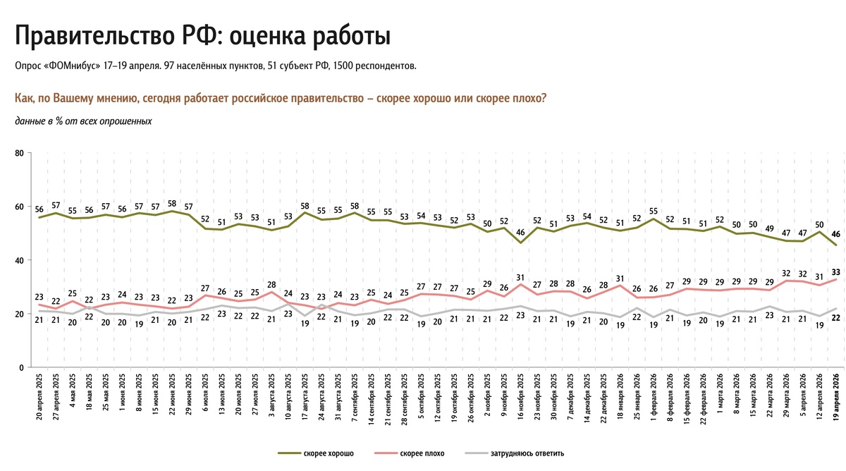 Фонд "Общественное мнение" (ФОМ) провёл очередное исследование общественных настроений в России, посвящённое оценке деятельности органов власти и политическим предпочтениям граждан. Согласно полученным данным, фиксируется снижение показателей одобрения работы действующего руководства страны. В частности, положительную оценку деятельности президента России Владимира Путина дают 76% опрошенных, при этом уровень доверия к главе государства составляет 74%. По сравнению с февралём эти показатели снизились на 4 и 6 процентных пунктов соответственно, когда положительно работу президента оценивали около 80% респондентов. Оценки деятельности правительства также демонстрируют снижение. Около 46% участников опроса считают, что кабинет министров работает скорее хорошо, тогда как 33% придерживаются противоположного мнения. В феврале доля положительных оценок составляла 51%, а отрицательных — 29%, что указывает на снижение на 5 и 3 процентных пункта. Работу председателя правительства Михаила Мишусти