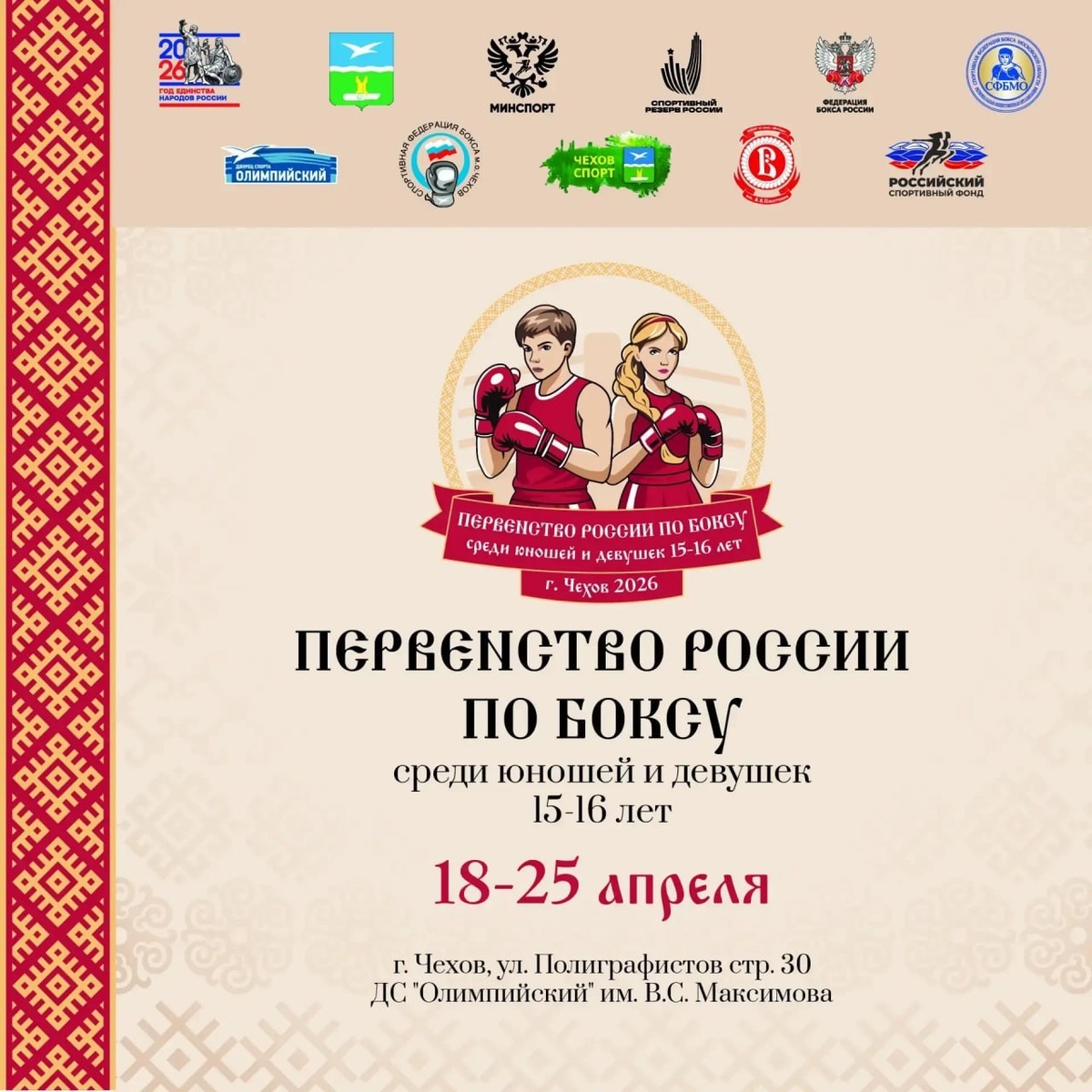 ✨ ПЕРВЕНСТВО РОССИИ ПО БОКСУ🥊 С 18 по 25 апреля среди юношей и девушек 15-16 лет. В турнире примут участие более 500 спортсменов, среди них 6 из Чехова. 👉18 апреля в 12:00 церемония торжественного открытия 🥊С 18 по 25 апреля поединки пройдут на малой спортивной арене. 🏆25 апреля состоятся финальные поединки и в 12:00 торжественная церемония закрытия турнира. 📆 25.04.2026 🕛 12:00 🏢 ДС «Олимпийский» им. В. С. Максимова 📍 г. Чехов, ул. Полиграфистов, стр.30 🪙 Вход свободный❗️ ⭐Поддержать канал голосом ✅ Мероприятия Чехов https://dzen.ru/id/66cc4b48e9ef144699238a51 https://vk.ru/chekhov_events http://dzen.ru/chekhov_events