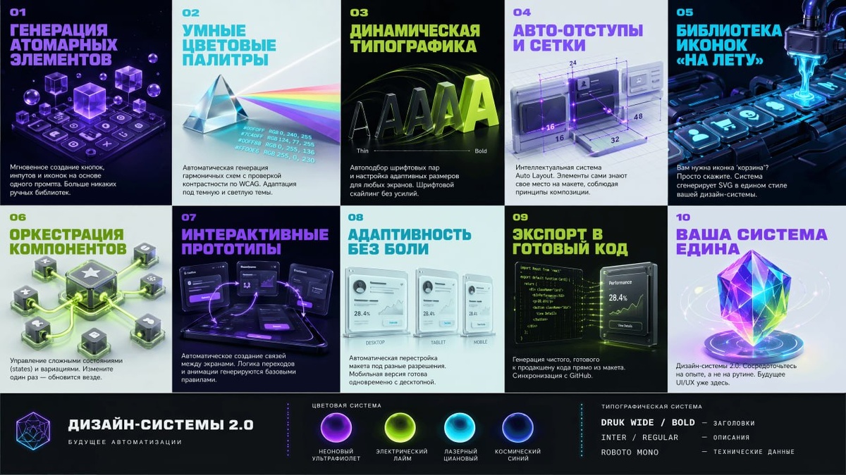 Палитра, шрифты, стиль иллюстраций, иконки, всё выдержано в одном ключе от первого слайда до последнего. Промпт: Создайте презентационную панель UI/UX для раскадровки карусели в Instagram под названием: «Будущее креативного дизайна с AI» — показываем, как AI помогает создавать визуальный контент, оптимизировать рабочий процесс и вдохновлять. Сетка из Х слайдов (2 строки, 5 столбцов, соотношение 4:5) + нижняя панель пользовательского интерфейса. Стиль: минимализм, технологичность, футуристический, чистый белый фон с ярко-розовым акцентом. Цвета: белый фон, ярко-розовый (#FF0080) акцент, мягкие пастельные тени. 3D объекты: плавные, матовые формы с мягким свечением. Шрифты: заголовки Druk, основной текст — геометрический sans-serif. Слайды и новые заголовки: S01 (темный фон, розовый акцент): Заголовок: "AI, который вдохновляет" 3D объект: светящийся куб с абстрактными линиями, символ креативного процесса S02 (светлый фон, розовый текст): Заголовок: "Создание визуальных историй за сек