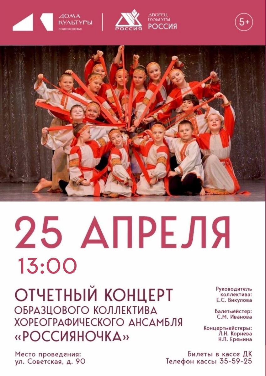 »! Вас ждёт: 👉потрясающие номера от наших талантливых артистов; 👉любимые композиции в новой интерпретации; 👉особая атмосфера, созданная годами традиций; 👉и, конечно, выступления ветеранов коллектива — тех, кто стоял у истоков и помог «Россияночке» стать такой, какой мы её знаем и любим! ❤ 🚫 Возраст: 0+ 📆 25.04.2026 🕒 13:00 🏢 Дворец культуры «Россия» 📍 г. Серпухов, ул. Советская, д. 90 💰 Билеты в кассе ДК ⭐Поддержать канал голосом 💰 Канал Вакансии Серпухова ✅ Мероприятия Серпухов https://dzen.ru/id/66f01c6eb4c6fe60c9ca1608 https://vk.ru/serpukhov_events http://dzen.ru/serpukhov_events
