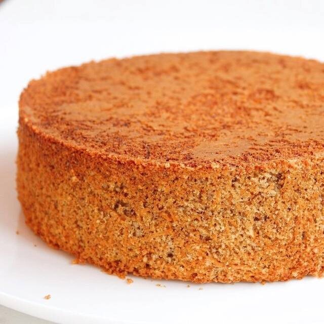 на форму диаметром 19-20 см 📝Мы в MAX — max.ru/tortodel Очень вкусный нежный и ароматный бисквит, который выпекается в одной форме. Яйцо С2 - 5 шт Сахар - 130 г Морковь - 220 г (уже очищенная) Мука 160 г Масло растительное - 50 г Грецкие орехи - 70 г Цедра одного лимона Соль щепотка Разрыхлитель - 10 г 1. Взбиваем яйца с солью в очень плотную белую массу (~10 минут планетарным миксером) 2. Добавляем масло, муку и разрыхлитель через сито, перемешиваем аккуратно лопаткой, чтобы не повредить воздушность 3. Далее морковь на мелкой терке, цедру и измельчённые орехи 4. Выкладываем в форму диаметром 19-20 см и выпекаем при 170 гр до сухой зубочистки (~ 40 мин) 5. Полностью остужаем, оборачиваем пленкой и убираем в холодильник на несколько часов 6. Далее можно разрезать на коржи. Я обычно делаю два коржа и большую прослойку крема и карамели внутри. Сверху украшаю ягодами
