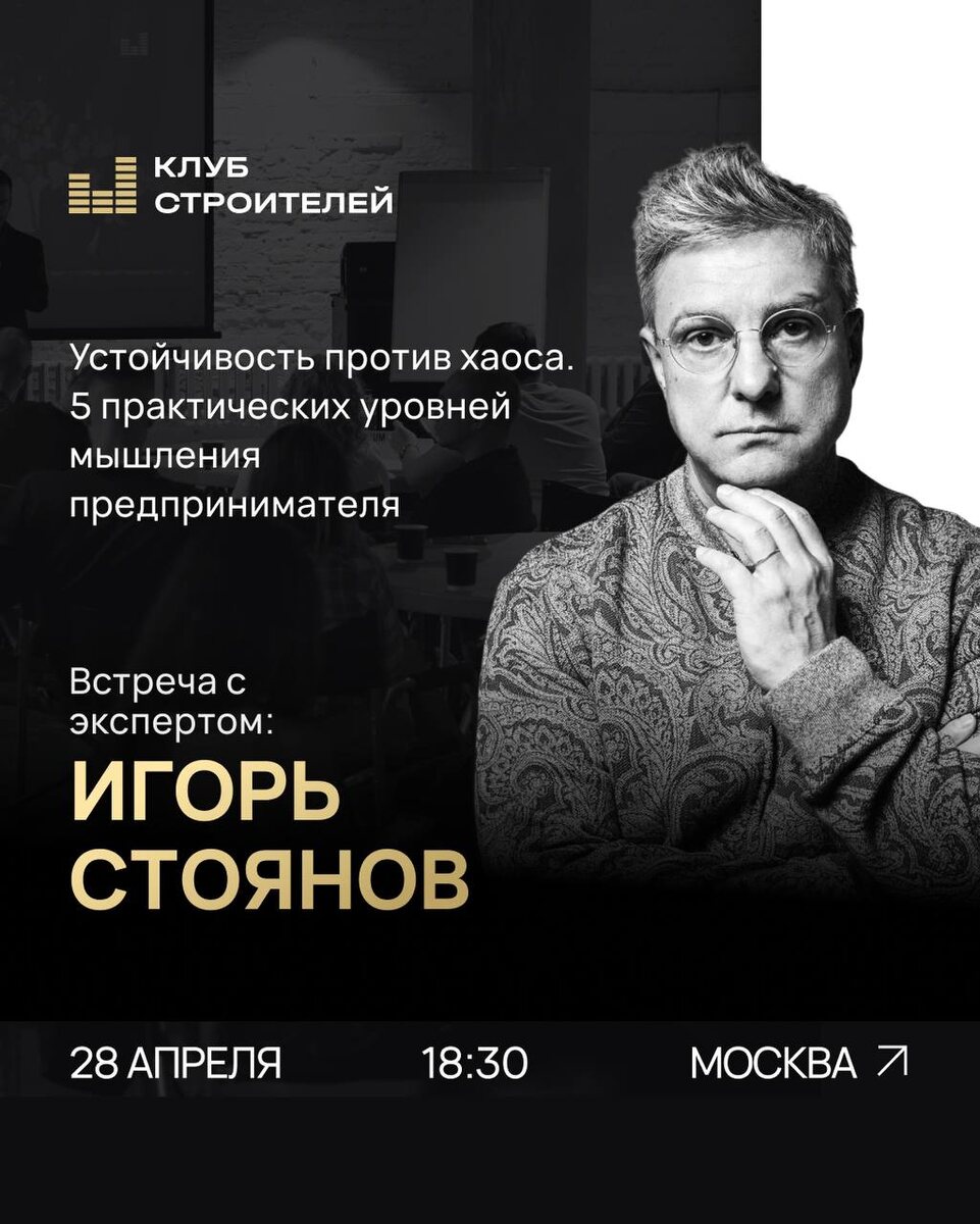 ▪️ 28 апреля в 18:30 состоится встреча с экспертом Игорем Стояновым 👉 Игорь Стоянов: ▪️Предприниматель, президент и основатель сети имидж‑лабораторий ПЕРСОНА (более 130 салонов красоты по всему миру с годовым оборотом 3 млрд. рублей) ▪️Президент Ассоциации предпринимателей индустрии красоты (АПИК) ▪️Играющий бизнес-тренер, практик ▪️Вдохнул жизнь в более чем 1000 стартапов и лидеров, и в более чем в 10 000 специалистов ▪️ Тема: «Устойчивость против хаоса. 5 практических уровней мышления предпринимателя» 🔈О чем будет встреча: «Путь от эксперта к стратегу порой занимает всю жизнь. Мышление определяет масштаб. Валюта эксперта — знания, валюта достигатора — успех и деньги, индивидуалиста — ценности и наследие; стратег использует парадоксы и интегрирует все предыдущие логики. ▪️Мы исследуем, с какого уровня можно решить задачи, если они давно не решаются на том уровне, на котором находятся сейчас. Связки и нелинейные процессы меняют картину и помогают прорваться на следующий уровень»