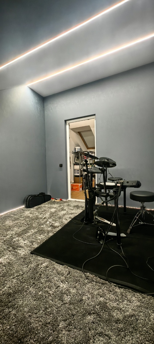Вводная: К нам пришёл заказчик, который хотел играть на барабанах в своё удовольствие, но… второй этаж дома — это зона домочадцев. Не лишать же близких покоя? Решили выделить пространство, где всем будет комфортно.