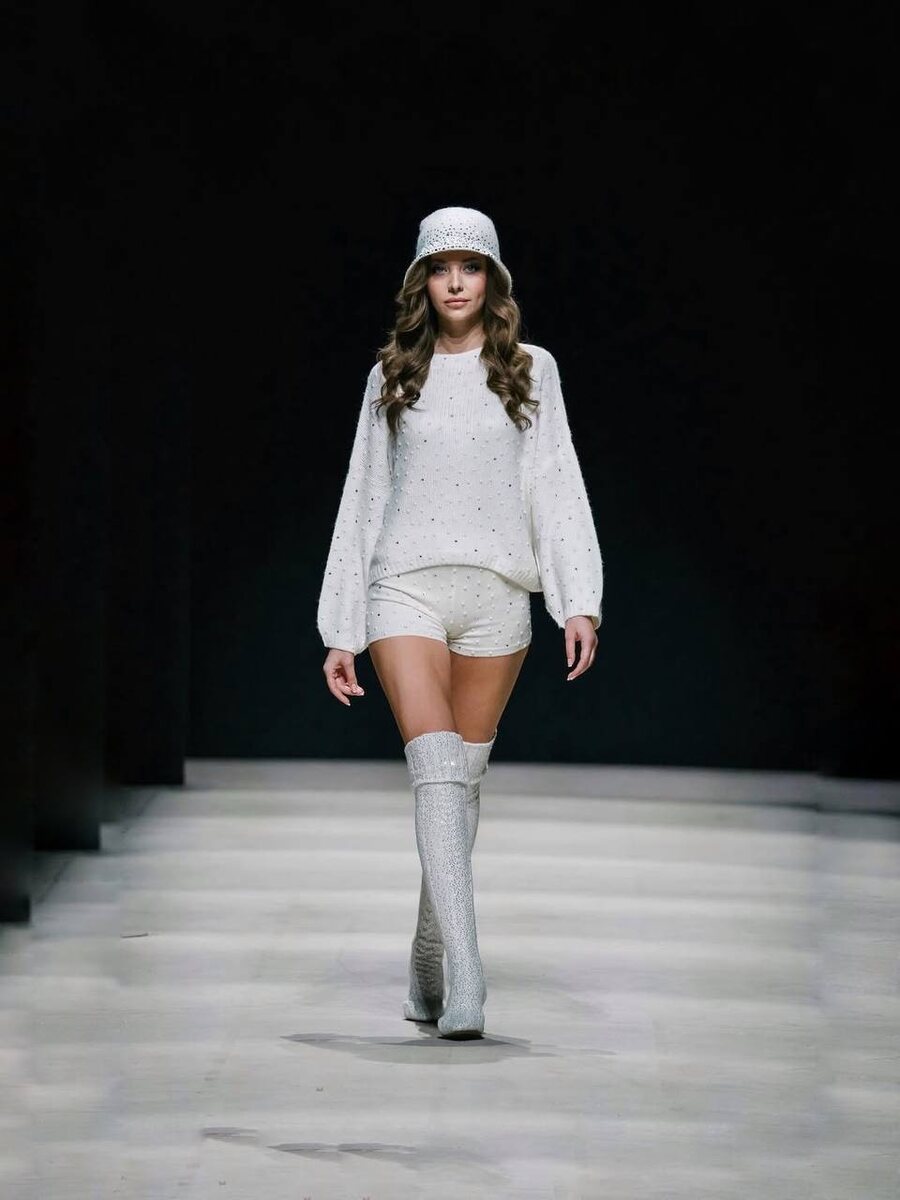 🤍 Лёгкая игривость и современный комфорт: мягкий свитер с объёмными рукавами и мини-шорты, украшенные жемчужинами и кристаллами, создают свежий и расслабленный образ. В тон сияющие панама и сапоги-чулки дополняют лук. Простой, но запоминающийся аутфит для тех, кто ценит удобство и оригинальность.
