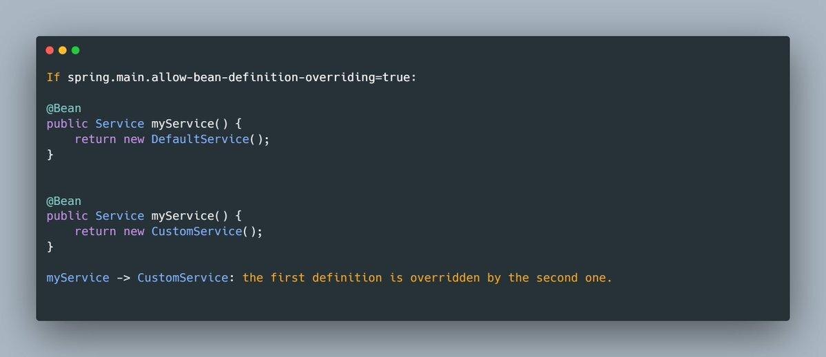 Лучше не менять значение по умолчанию: spring.main.allow-bean-definition-overriding=false Что это делает? Если в приложении два бина с одинаковым именем, Spring не запустится. И это на самом деле хорошо. Почему: ✔ помогает сразу увидеть конфликт конфигурации ✔ не даёт одному бину тихо перезаписать другой ✔ предотвращает скрытые баги в DI Если же включить: spring.main.allow-bean-definition-overriding=true • тогда второй бин молча перезапишет первый. В результате приложение запустится, но будет использовать не тот бин, который вы ожидали. И такие баги потом очень сложно найти. Иногда лучше получить ошибку при старте, чем искать проблему в продакшене. #SpringBoot #Java #Backend ⚡️ Полезные ресурсы по Java 🚀 Max @javarush