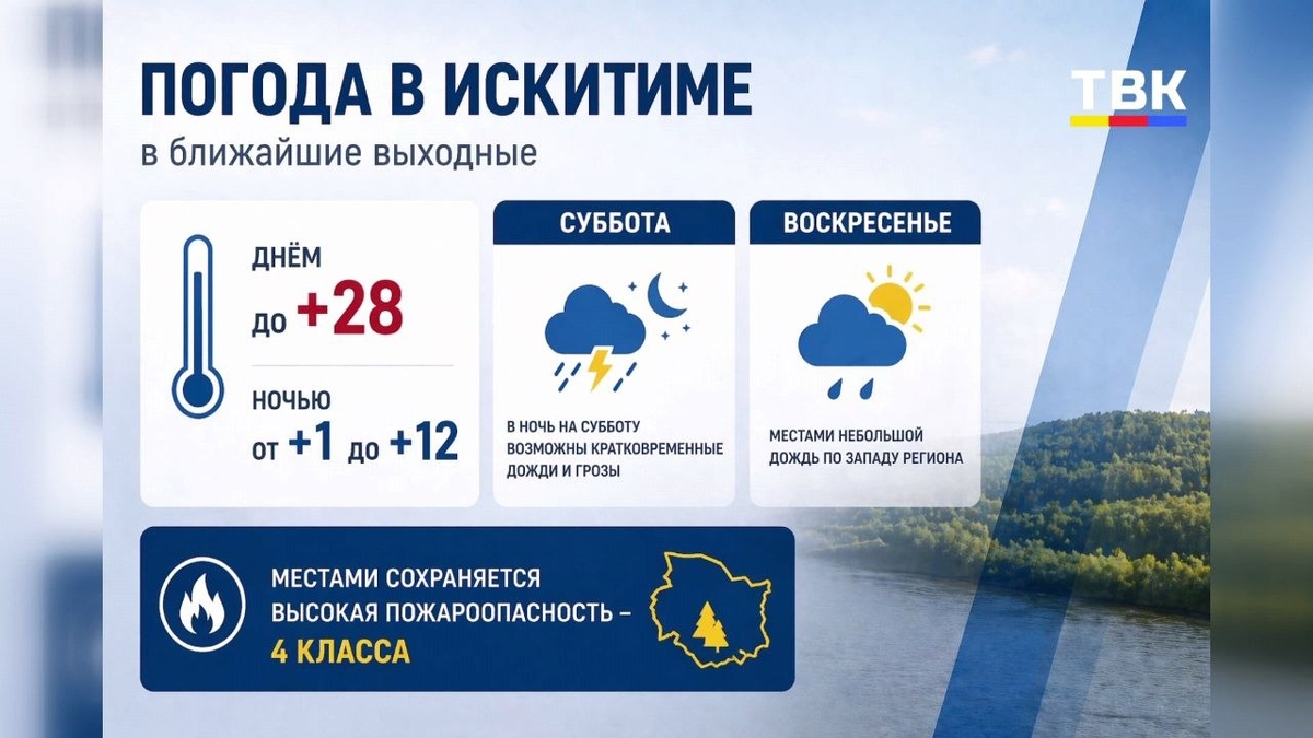 Отдыхать будем в два блока: с 1 по 3 мая и с 9 по 11-е. Между ними — короткая рабочая неделя, с 4 по 8 мая. Предпраздничные дни — 30 апреля и 8 мая — сокращённые на один час. В Искитиме в ближайшие выходные ожидается до +28 днём, ночью — от +1 до +12. В основном без осадков, но в ночь на субботу возможны кратковременные дожди и грозы. В воскресенье — местами небольшой дождь по западу региона. Местами сохраняется высокая пожароопасность – 4 класса. Так, что соблюдайте правила безопасности. #новости_Искитим #ТВК