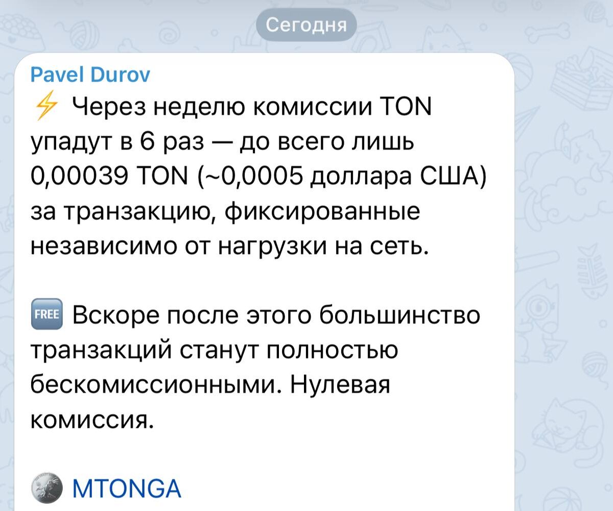 Дуров заявил, что уже через неделю комиссии TON сократятся в шесть раз — до фиксированных 0,00039 TON (примерно $0,0005) за одну транзакцию