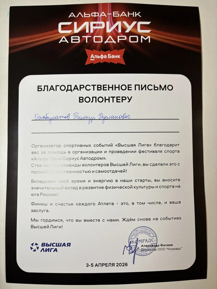 Награда вручена за активную помощь в подготовке и проведении масштабного события — фестиваля спорта «Альфа-Банк Сириус Автодром». Работа студента способствовала успешной реализации программы мероприятия на одной из ключевых площадок страны.