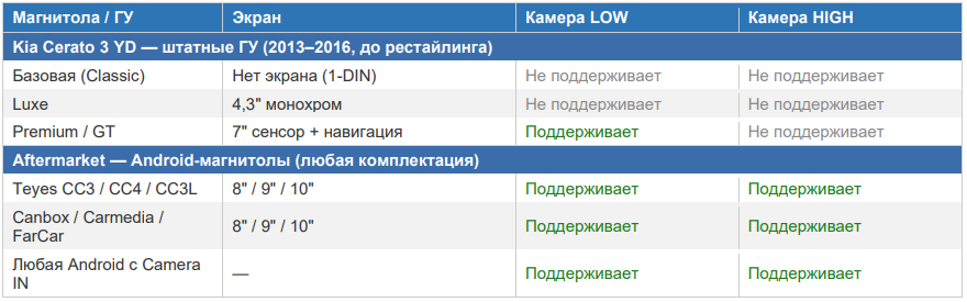 Kia Cerato 3G YD (2013–2016) поставлялась в Россию с тремя принципиально разными головными устройствами. Поддержка камеры зависит от конкретной магнитолы: базовая и Luxe не имеют видеовхода, Premium — поддерживает штатно.