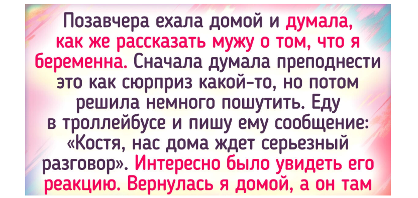 Позавчера ехала домой и думала, как же рассказать мужу о том, что я беременна. Сначала думала преподнести это как сюрприз какой-то, но потом решила немного пошутить. Еду в троллейбусе и пишу ему сообщение: «Костя, нас дома ждет серьезный разговор». Интересно было увидеть его реакцию. Вернулась я домой, а он там уборкой занимается! Никогда не видела, чтобы он сам организовывал генеральную уборку. На плите картошку жарит, а в ванной наконец-то кран прикрутил. Эх, жаль, что не каждый день можно так «шутить». Пришлось рассказать, что серьезный разговор про то, что я беременна. Муж аж всплакнул от счастья.