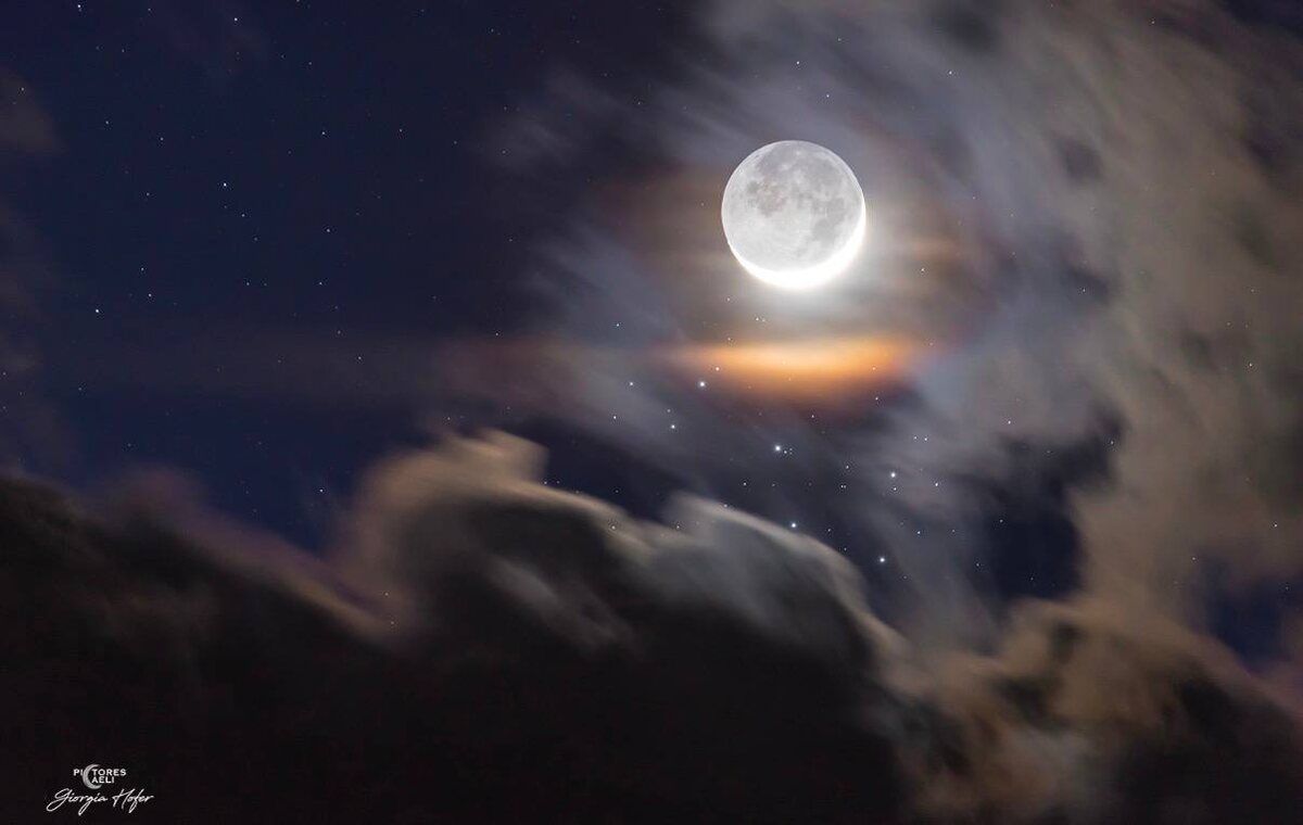 Дата: 2026-04-24 Автор снимка: Giorgia Hofer Озарённые солнцем рога молодого полумесяца, кажется, обнимают тёмную ночную сторону Луны на этом драматичном снимке, сделанном с планеты Земля. Что на этом кадре? Единая телеобъективная экспозиция была сделана ночью 19 апреля, когда двухдневная Луна находилась в перигее своей эллиптической орбиты. В ту же ночь молодая Луна оказалась на небе рядом с Плеядами - звёздным скоплением Семь Сестёр. Лунная корона: Млечный свет Плеяд собрался под ярким серпом Луны, видимым сквозь бледную, но красочную лунную корону (явление, вызванное дифракцией света на облаках). Пепельный свет: Ночная сторона Луны освещена пепельным светом - солнечным светом, отражённым от Земли. Это явление ярче проявляется весной в северном полушарии. Сейчас орбита Луны проходит рядом со звёздами Плеяд в земном небе примерно раз в месяц. Но наиболее зрелищные соединения видны именно в фазе молодого полумесяца. 👩🚀 Подписаться на канал. #Луна #молодаяЛуна #Плеяды #пепель