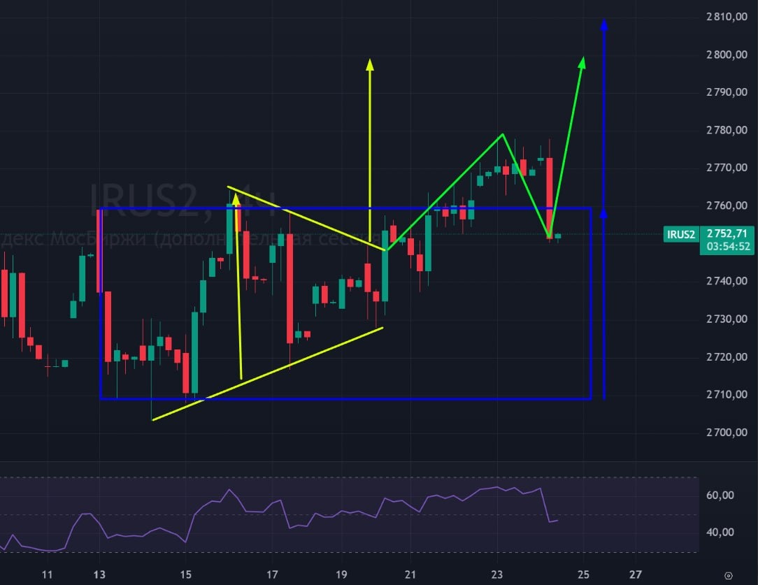 🟢Итак, в среду я рисовал на индексе две фигуры - желтый треугольник с целью на 2800, и синий прямоугольник (накопление) с целью на 2810. Видно, что реакции на верхнюю границу синего прямоугольника нет, то есть его убираем из логики. Остается желтый треугольник. В Этом варианте у нас получается выход из треугольника, сейчас происходит его тест, далее движение должно идти вверх на 2800. 🚗 Я остаюсь оптимистом и супербыком по рынку. Ничего страшного в российском рынке не случилось со снижением ставки на 0,5%. Жду движение по зеленой линии. #индекс #индексмосбиржи #ммвб #irus #mxi #mix #imoexf #bogdanoffinvest $MMM6 $MMU6 $MXM6 $MXU6 $IMOEXF