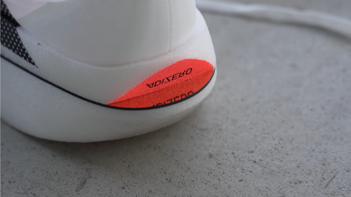 - ENERGYRIM. Вместо привычных стержней Energy Rods или сплошной карбоновой пластины — U-образный карбоновый обод по периметру. Центр передней части стопы свободен от карбона, чистая пена. Это снижает пронацию и даёт резкий «выстрел» носком. Элитные атлеты попросили — adidas сделали.