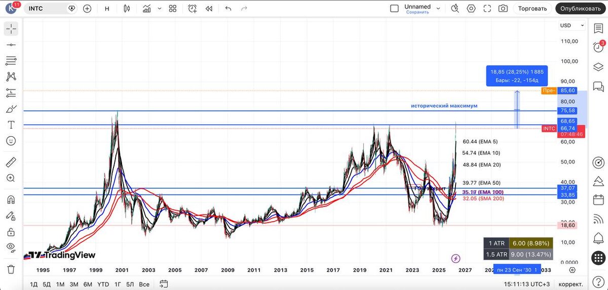 % 🤯 🔥 🚀 И спустя 26 лет пробивает свой исторический максимум. А рынок на премаркете сквизует, во многом благодаря как раз $INTC, где $SMH достигает юбилея в 500 $. Вот поэтому мы не ограничиваем движение рынка, зная, что в такие моменты происходит самый быстрый «бычий» моментум. Позиций по $INTC не было: перед отчетностью я не покупаю и не держу, т.к. отчет — это казино 🎰 Но есть эти бумаги, которые заблокированы до сих пор 😏 #intc #smh #полупроводники #отчет #технический_анализ #трейдинг_сша #тренд #фондовый_рынок