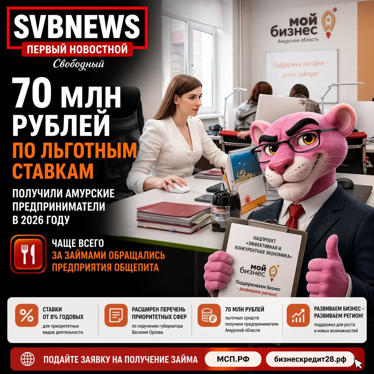». Одним из примеров стала история магазина японской кухни Екатерины Чусовитиной. Бизнес открылся в Благовещенске в разгар пандемии, а сегодня уже работает не только в областном центре, но и в Белогорске, Хабаровске. В ближайшее время новая точка появится в Тамбовке. По словам предпринимательницы, первый кредит с господдержкой помог быстрее запустить новую точку в Благовещенске, а второй — приобрести холодильное оборудование, необходимое для работы. При этом ставка оказалась ниже ожидаемой: вместо 14,5% займ удалось получить под 12%. Повторно за льготным кредитом обращалась и благовещенская кофейня. Благодаря поддержке бизнес смог не только удержаться в период роста налоговой нагрузки, но и открыть ещё одну точку. Общественное питание входит в число приоритетных направлений для региона. Для таких видов деятельности ставки по займам начинаются от 8% годовых. В этом году по поручению губернатора Василия Орлова перечень приоритетных сфер был расширен. Подать заявку на получение займа