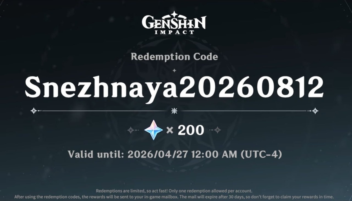 В честь этого завезли пачку промкодов с кучей плюшек: 😥A0NBWRZZI3XJ — ×20 камней истока, ×160 жеод воссоздания 😥INUHH574C91F — ×10 000 моры, ×10 опыта искателя приключений, ×5 превосходной руды усиления, ×5 жареной лапши с рыбой, ×5 острой курицы на пару 😥FairyGirlLinnea — ×30 камней истока, ×3 потрёпанных мандатов, ×20 000 моры 😥PSCA8NL4ZSPD — ×60 камней истока, ×5 опыта искателя приключений 😥8BHA0KFRG94K — ×60 камней истока, ×5 опыта искателя приключений 😥Snezhnaya20260812 — ×200 примогемов Промики вводим в игре или на сайте — время ограничено 📰 Следите за новостями вместе с нами