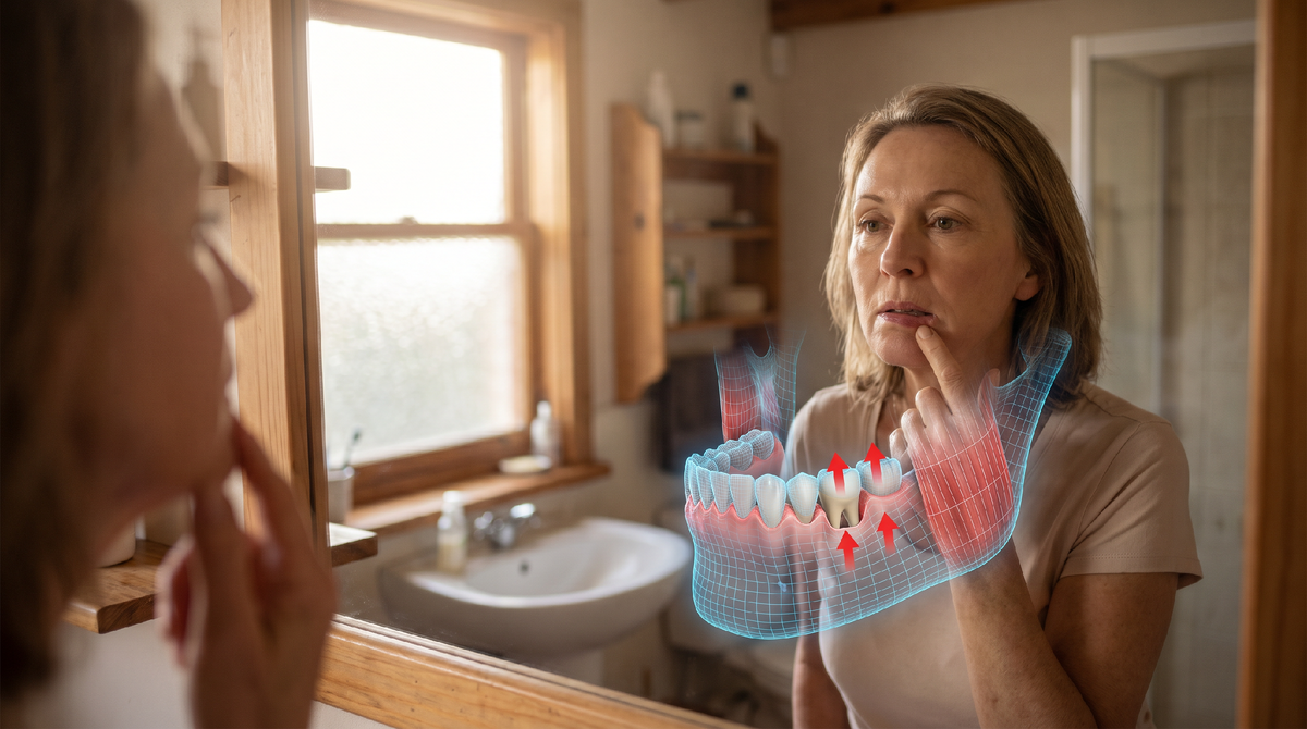 Жевательные мышцы в хроническом спазме тянут надкостницу. Надкостница тянет десну. Десна уходит вверх и обнажает корень. Стоматолог видит результат - но не видит причину. Потому что причина не в десне.