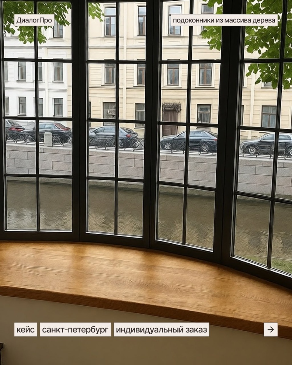 В этой карусели показываем уникальный проект — цельный подоконник из ясеня для эркера с панорамным остеклением