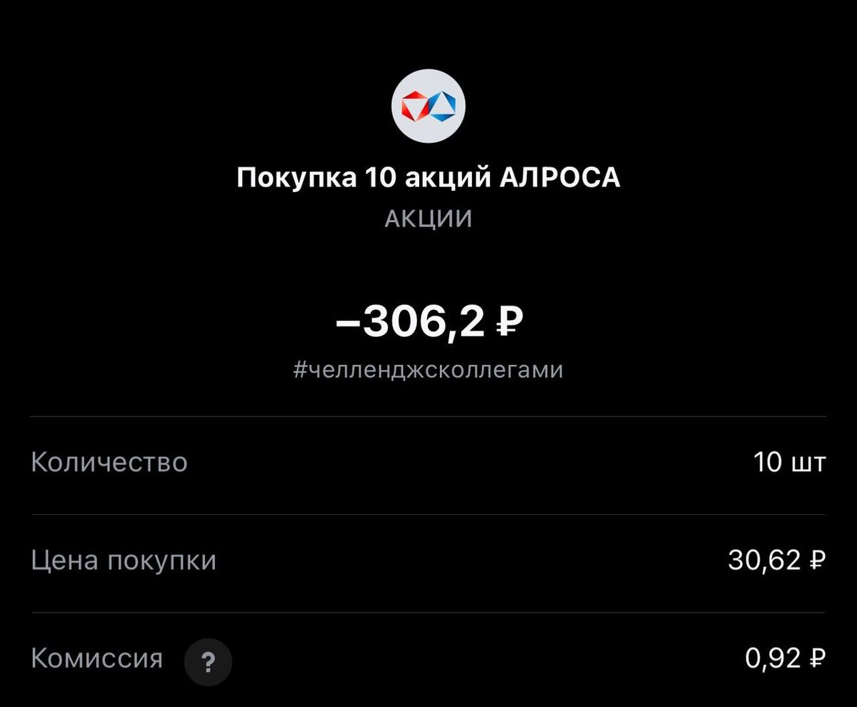 ! Сегодня покупка #400 с учетом оставшихся денег с прошлых сделок. Статистика портфеля на стороннем сервисе, можно посмотреть по "ссылке" Напомню это челлендж с коллегами, каждый рабочий день пополняем брокерский счет на 250 рублей и инвестируем. Если возникли вопросы или есть не понимание, что делать. Задавайте «тут» Покупка #400 🟢 "АЛРОСА" 30.62 rub #ALRS 1 лот #каждыйсможет #челенджсколлегами TG MAX