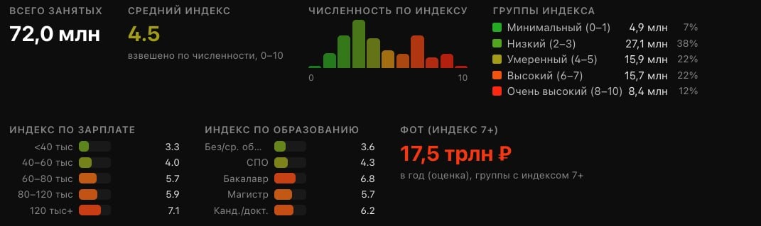 Есть одна цифра, на которую сейчас стоит смотреть внимательно — 17,5 трлн ₽. Это тот объём зарплат, который уже попал в зону, где бизнес начинает задаваться вопросом: «а можно ли это заменить?» Основной риск сейчас у офисных функций: аналитика, бэк-офис, менеджмент, всё, что можно разложить на понятные шаги — собрать данные, сделать презентацию, согласовать, перепроверить. Средний индекс заменяемости — 4,5 из 10. Это ещё не критично, но уже и не история, где «это никого не коснётся». По факту человек перестаёт быть основой процесса — он становится одним из способов его выполнения. Для рынка это не столько про технологии, сколько про деньги. Там, где такие функции начнут заменяться, будет расти маржа. Полный разбор с цифрами и деталями — ниже: https://smart-lab.ru/mobile/topic/1295023 😍 СМАРТЛАБ | 📲 Наш MAX