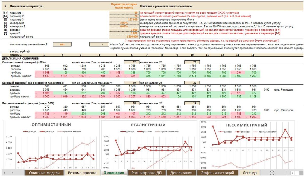 , которую делал около 12 лет назад И скажу вам, что вполне себе неплохо смотрится 🔥 — 3 сценария (правда, по текущим меркам довольно несложные графики) — выведены ключевые показатели — есть необходимая детализация — возможность на лету менять параметры, которые позволяют прогнозировать в реальном времени 3 сценария развития компании в зависимости от всяких показателей и параметров, которые мы туда закладываем ➡️ В те времена было модно моделировать сценарии визуально на одном экране, чтобы человек сразу видел, что будет, если всё хорошо, и что будет, если всё плохо. Если интересно больше про сценарный анализ, накидайте реакций: наберем 25 ❤️, запишу отдельный подкаст. 🎁 Получить в подарок логическую карту по финансам в бизнесе на e-mail Exchequer