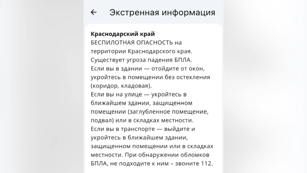 Предупреждение отправили через СМС. На территории Краснодарского края действует режим беспилотной опасности из-за угрозы падения БПЛА. Жителям рекомендовали соблюдать меры предосторожности. Если человек находится в здании, необходимо отойти от окон и укрыться в помещении без остекления — например, в коридоре или кладовой. Тем, кто находится на улице, советуют зайти в ближайшее здание, защищенное помещение, подвал или укрыться в складках местности. Если сигнал застал в транспорте, следует выйти и найти ближайшее безопасное укрытие. При обнаружении обломков беспилотника жителей просят не приближаться к ним и сразу звонить по номеру 112. Ранее «КИ» писали, что после ударов беспилотников в стационарах Краснодарского края остаются семь человек, среди них двое детей.