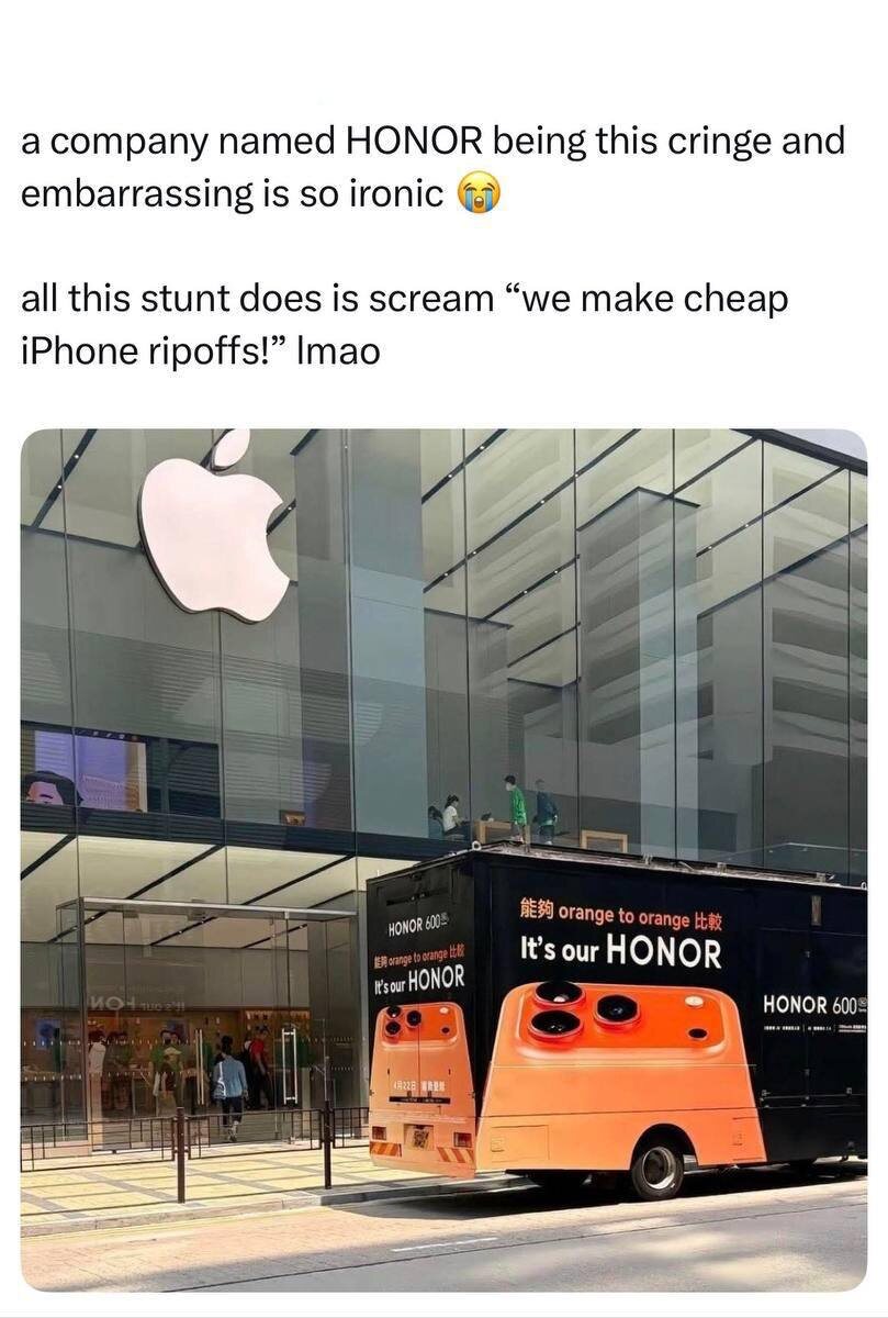 😁 Honor припарковал грузовик с подделкой iPhone 17 Pro возле входа в Apple Store в Гонконге