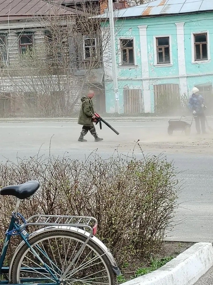 Это нормально так убирать улицу, приспособлением, которое предназначено для уборки листьев с травы?! Кто до этого додумался?
