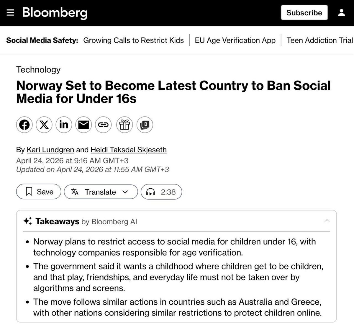 🇳🇴 В Норвегии готовят закон, который запретит детям до 16 лет пользоваться соцсетями.