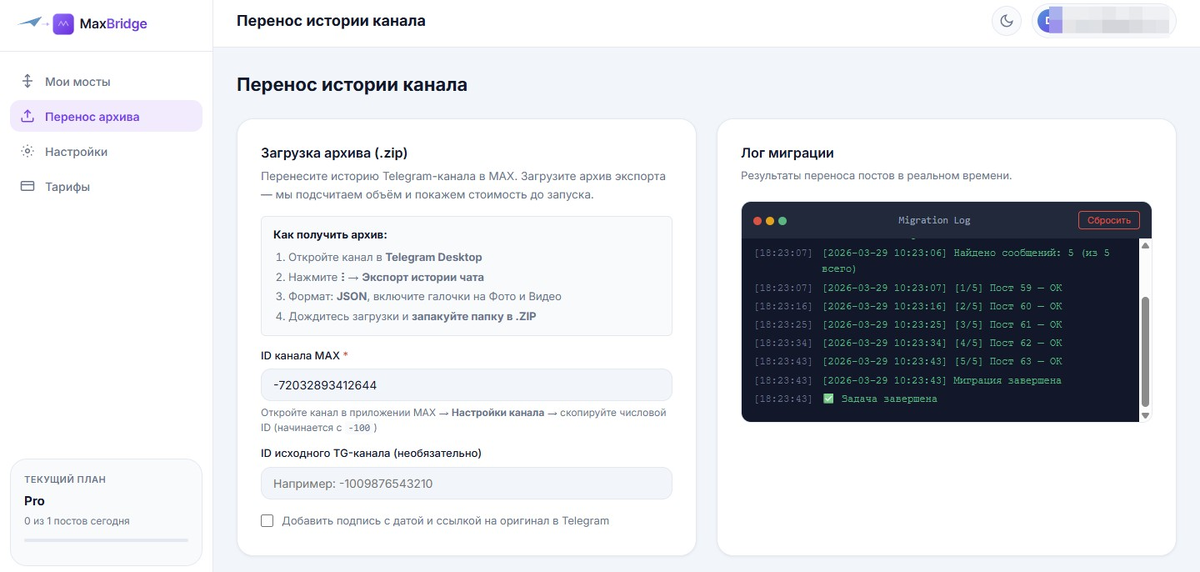 • История канала или чата переносится через экспорт из десктопного Telegram и загрузку этого архива в MaxBridge.