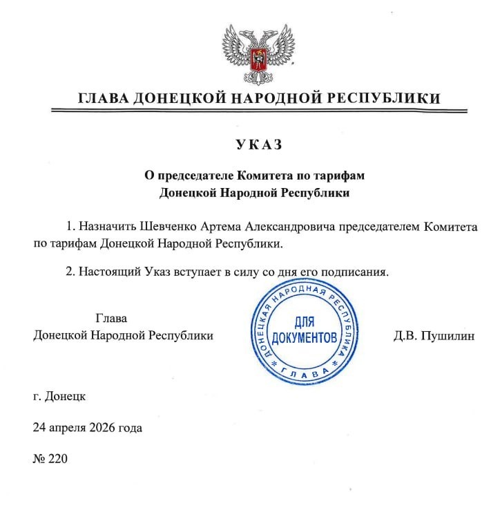 Денис Пушилин назначил Шевченко Артёма Александровича председателем Комитета по тарифам ДНР