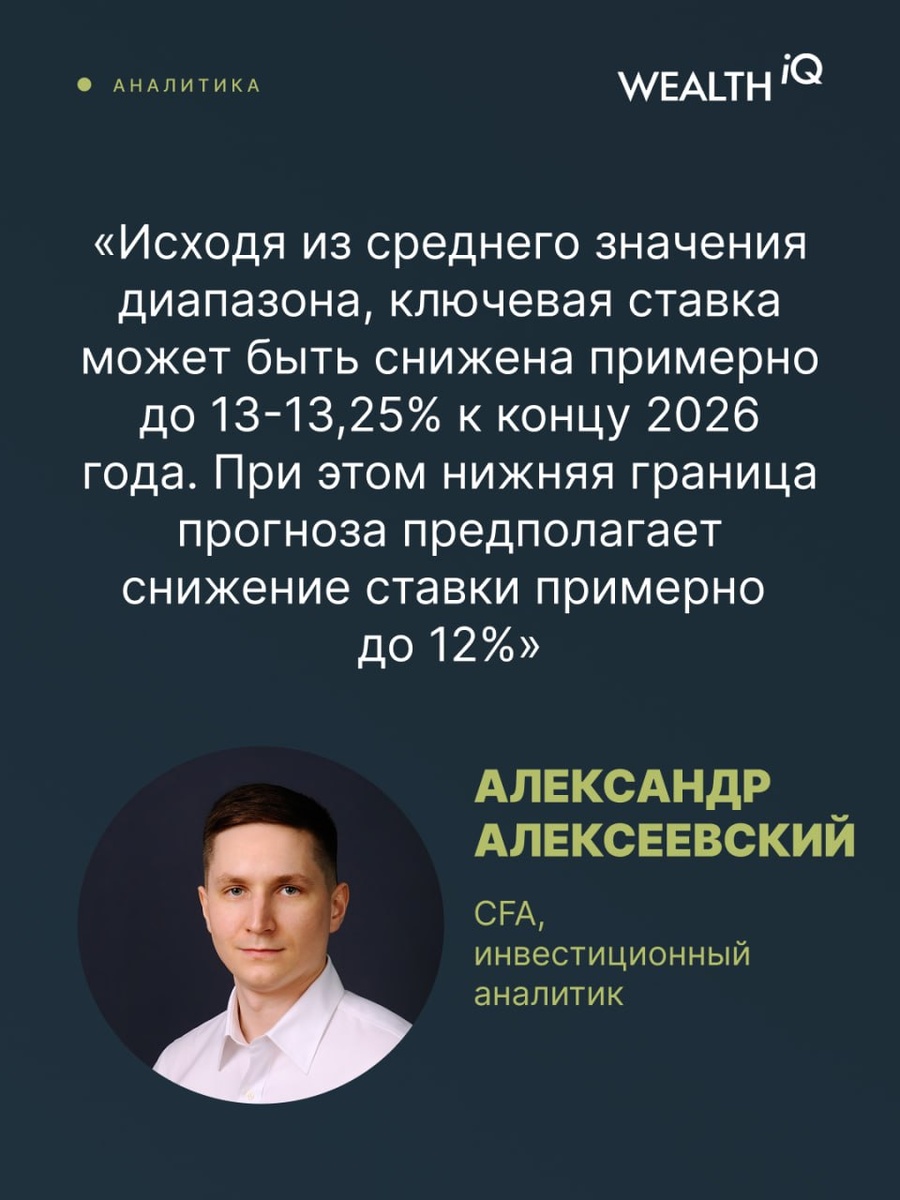 Разбираемся 💬 Александр Алексеевский, CFA, инвестиционный аналитик Wealth iQ Сегодня Банк России снизил ключевую ставку на 50 б. п. до 14,5%. В ходе пресс-конференции Эльвира Набиуллина сообщила, что на текущем заседании рассматривалось два варианта: сохранение ставки и ее снижение на 50 б. п. Сигнал регулятора снова остался мягким. Банк России будет оценивать целесообразность дальнейшего снижения ключевой ставки на ближайших заседаниях. По заявлению регулятора, показатели устойчивого роста цен пока не снижаются и, по оценке Банка России, остаются в диапазоне 4-5% в пересчете на год. Также сохраняется существенная неопределенность со стороны внешних условий и параметров бюджетной политики. ЦБ отмечает, что в случае более высоких расходов бюджета, сопровождаемых ростом структурного дефицита, потребуется более жесткая денежно-кредитная политика, чем в базовом сценарии. Данное заседание было опорным, поэтому регулятор обновил свой среднесрочный прогноз. Ключевое изменение - повышен