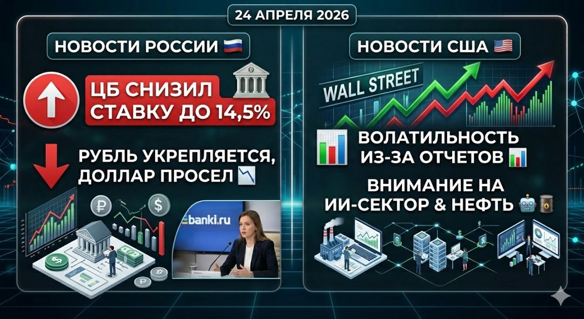 Главные новости последних дней, которые определяют движение рынков в России и США. Разбираемся, что происходит с вашими деньгами. 🇷🇺 Россия: Ставка вниз, рубль вверх - Центробанк смягчает политику. Банк России сегодня принял решение снизить ключевую ставку восьмой раз подряд — теперь она составляет 14,5% годовых (минус 50 б.п.). Регулятор отмечает, что инфляция замедляется быстрее ожиданий (до 5,7% на 20 апреля). - Что это значит? Ставки по вкладам продолжат падать — если у вас заканчивается депозит, фиксировать доходность лучше сейчас. Кредиты и ипотека, напротив, станут чуть доступнее. - Рубль демонстрирует силу. Курс доллара на этой неделе заметно просел, опустившись в район 74,8–75 рублей. Основные факторы поддержки: подготовка экспортеров к налоговым выплатам и приток валюты на фоне стабилизации торгового баланса. - Фондовый рынок. Индекс Мосбиржи консолидируется. Инвесторы отыгрывают корпоративные отчетности за первый квартал и надеются на дивидендные сюрпризы от госкомпан