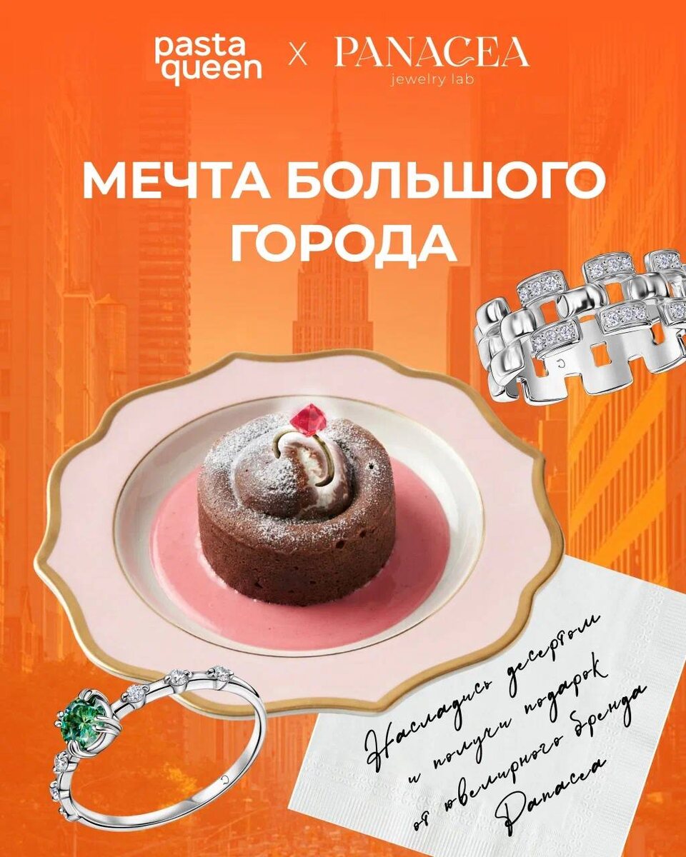 ! 🍝 До конца апреля в сети ресторанов Pasta Queen действует специальное меню, вдохновленное культовым сериалом «Секс в большом городе». Решительная Миранда, романтичная Шарлотта, искренняя Кэрри или смелая Саманта… Кто ты сегодня? При заказе десерта «Мечта большого города» за 1 200 рублей гость становится обладателем карточки одной из четырех героинь, каждая из которых отличается своим темпераментом, ритмом и стилем жизни. Достаточно возвращаться в ресторан и собирать отметки: три визита превратятся в сертификаты Panacea Jewelry Lab на 5 000 или 10 000 рублей. Побежали? Наш канал в MAX