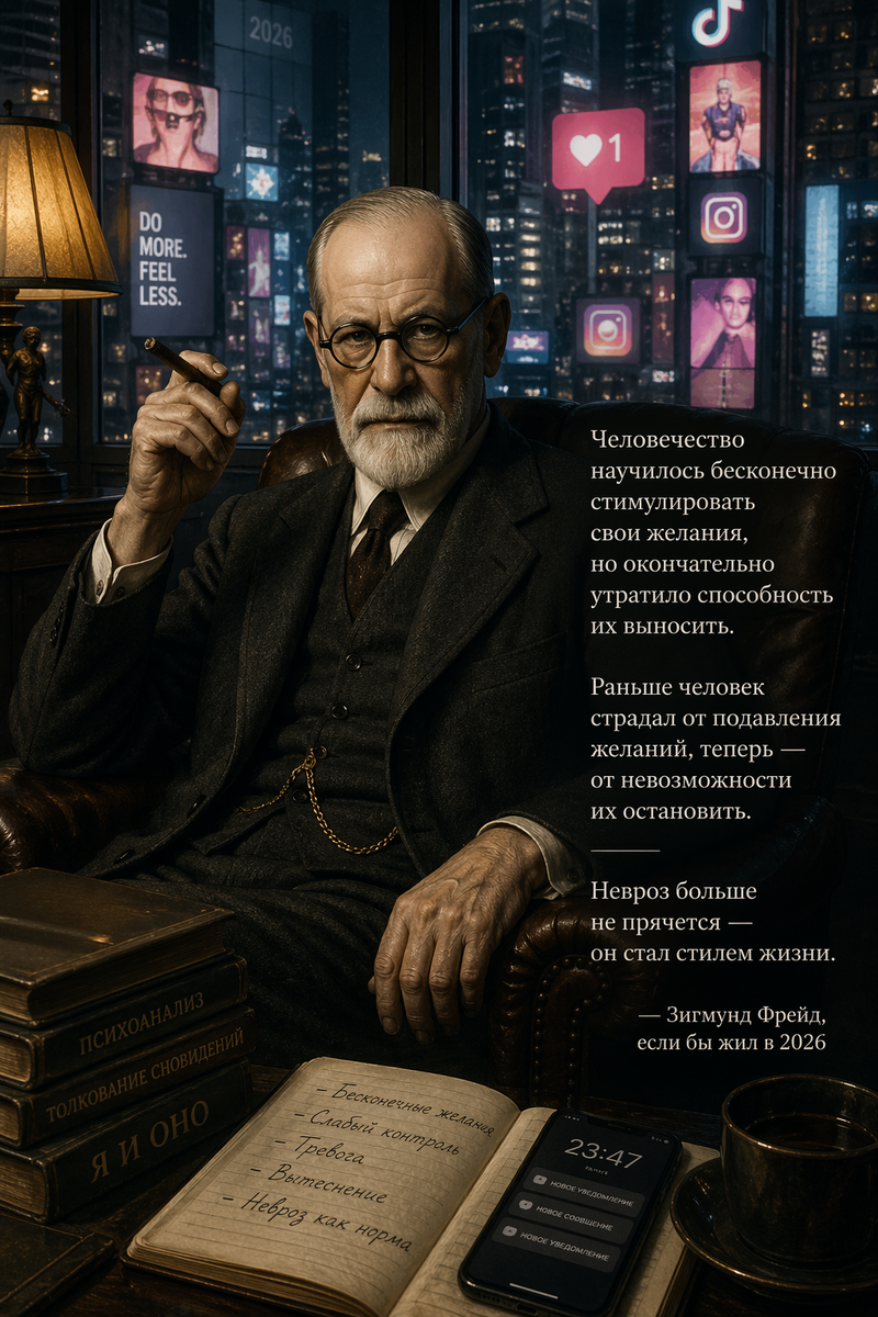 Если бы Зигмунд Фрейд оказался в 2026 году, он, скорее всего, не стал бы говорить долго, он бы сформулировал коротко, почти холодно: «Человечество научилось бесконечно стимулировать свои желания, но окончательно утратило способность их выносить».