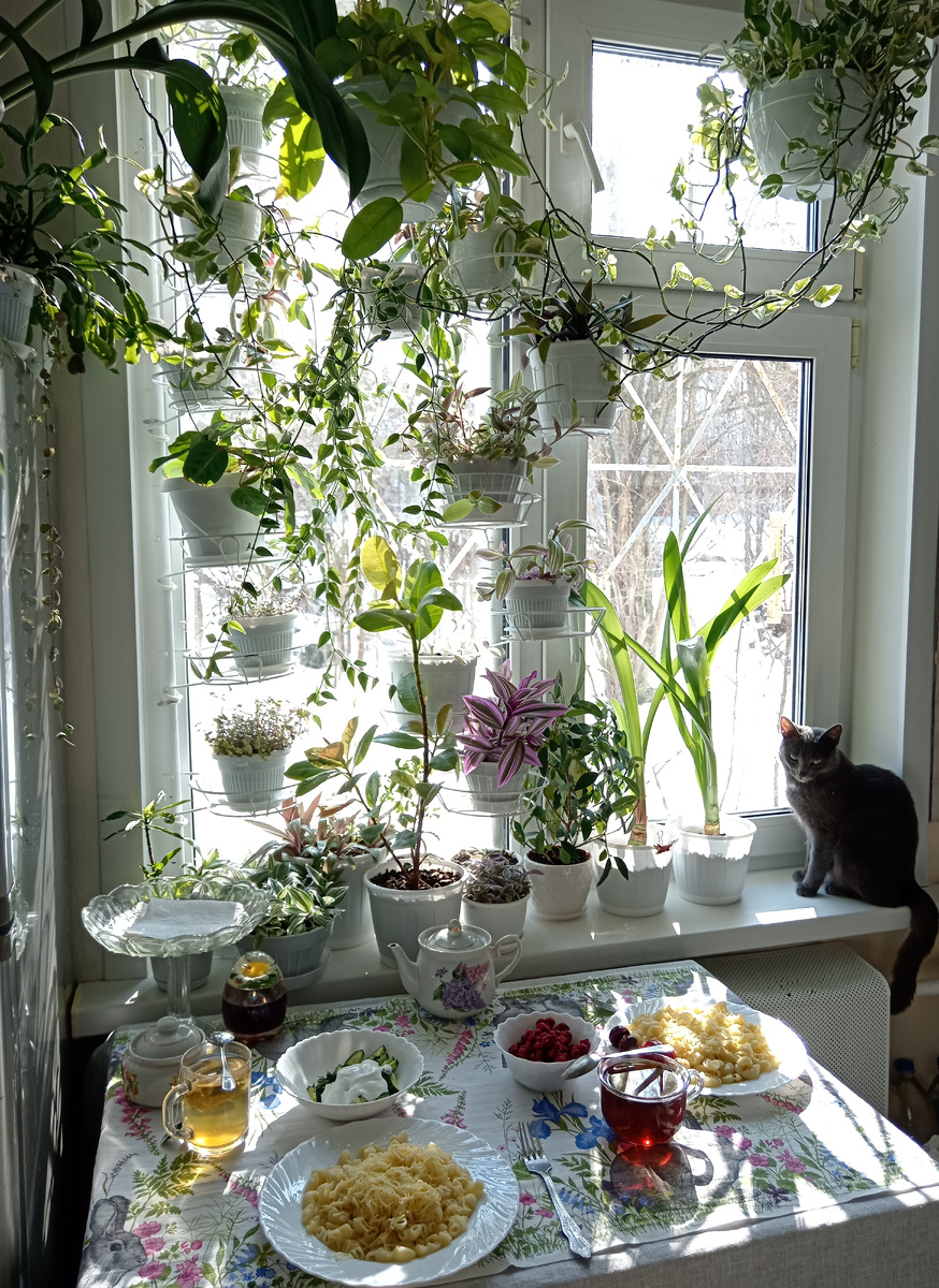 7:46. Проснулась от яркого солнышка, проглядывающего сквозь листья моих зелёных любимцев.