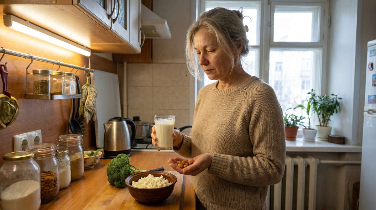 Посчитаем будний день. Стакан кефира - 240 мг. Сто граммов творога - 150 мг. Тридцать граммов твёрдого сыра - 240 мг. Горсть миндаля - 80 мг. Тарелка брокколи на гарнир - 90 мг. Плюс остатки по крупам и хлебу - ещё 150–200 мг. Итого около 950–1000 мг без единой капсулы. Это суточная норма.