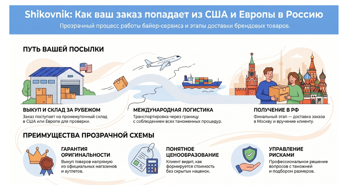 Рынок “байеров” в 2024–2026 стал взрослее: клиенты хотят не просто “достать сумку”, а понимать как формируется цена, какие сроки, что с оригинальностью, и что делать, если размер не подошёл. Меня зовут Елена Фролова, я развиваю сервис Shikovnik (shikovnik.ru) и расскажу, как выглядит прозрачная схема доставки товаров из Европы и США в Москву — без магии, но с системой. Что такое “байер-консьерж” на практике