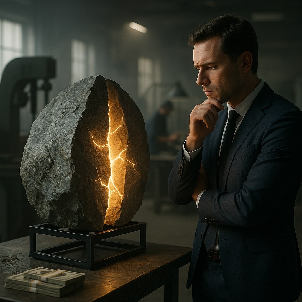 ! На первый взгляд — просто булыжник. Но распили его, добавь подсветку — и это уже интерьерный объект за 99 000 ₽! 💡 Мы берем валуны весом 500 кг. Распиливаем, ставим каркас и свет — получается «трещащий» камень с мягким свечением. 🚀 Себестоимость — около 26 000 ₽. Прибыль с одного камня — 73 000 ₽! Но для запуска нужно 4,3 млн ₽. Смогут ли 10 камней в месяц принести 560 000 ₽ прибыли? Полный разбор — в тг. Запустил бы такое?