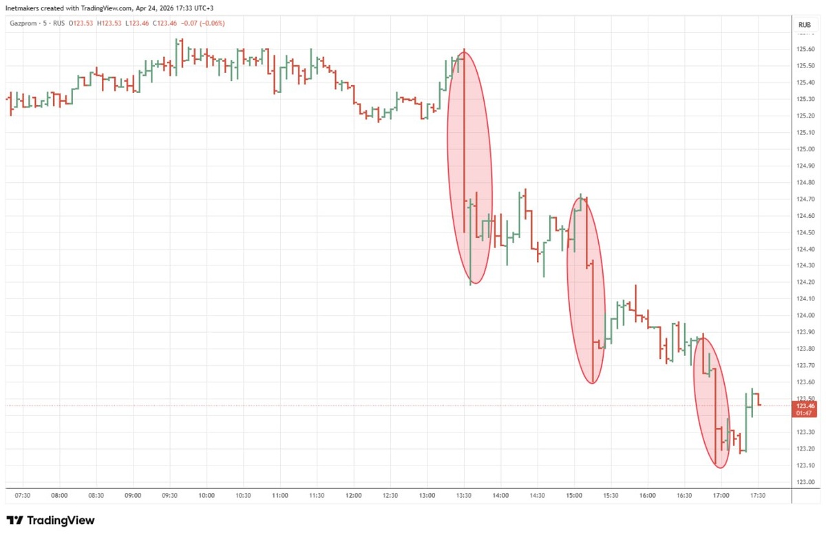 Вот смотрите 5-минутный график "Газпрома" - четко видны 3 таких резких падения, которые не могут объясняться вдруг нахлынувшими на инвесторов чувствами страха, там или еще чего-то. Так как в остальное время рынок скорее движется в бок. Не видеть этого, особенно учитывая 4 предыдущих спокойных дня невозможно! Ну просто люди маскируют свои действия некоей реакцией рынка на решения ЦБ.