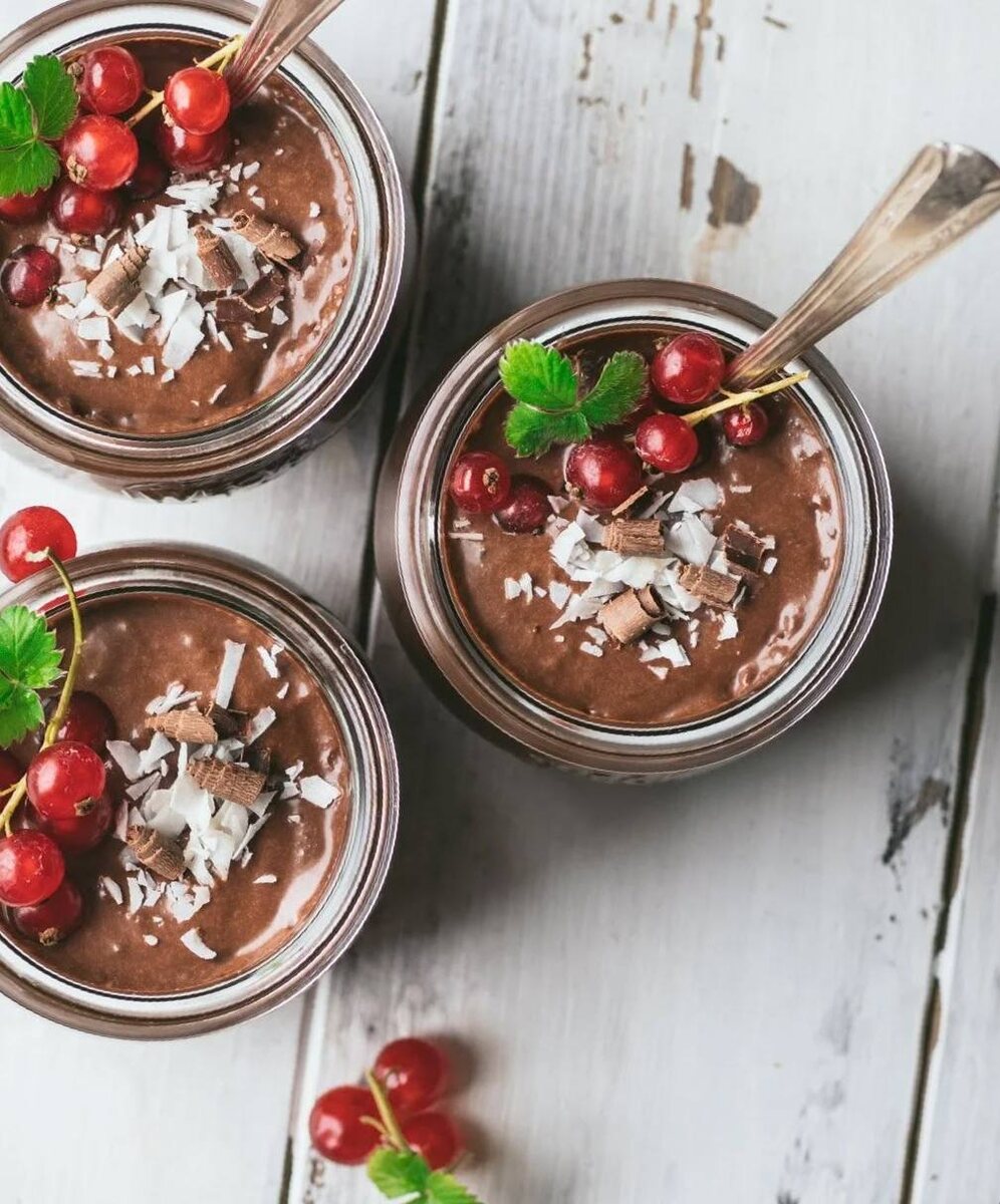 ) 🔻Сладкий полезный перекус без сахара, муки и выпечки 🍫 Готовим вечером — едим утром. Идеально, когда хочется десерта, но не хочется срывать метаболизм. 📝 Ингредиенты (на 2 порции) 🔻Семена чиа (белые или чёрные) 4 ст. ложки 🔻Молоко (кокосовое, миндальное или обычное 2,5–3,2%) 300 мл 🔻Банан спелый 1 шт. (около 120 г) 🔻Какао-порошок без сахара 2 ст. ложки 🔻Ягоды замороженные (черника, малина, клубника) 100 г 🔻Ваниль или корица (по желанию) 1 щепотка 🔻Для посыпки (по желанию): кокосовая стружка, дроблёный миндаль, тёмный шоколад 75%+ по вкусу ⏱️ Приготовление (10 минут + ночь в холодильнике) 1. Ягодный слой Ягоды разморозить (или взять свежие), размять вилкой с 1 ч. ложкой воды до состояния пюре. Разложить пюре по дну или (оставить на середину)двух стаканов или небольших банок (200–250 мл). 2. Шоколадный слой В блендере смешать: молоко, банан, какао, ваниль. Взбить 30 секунд. Всыпать семена чиа, перемешать ложкой. 3. Сборка: Аккуратно вылить шоколадную смесь поверх ягодн