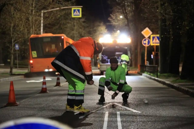 На улицах Калининграда начали обновлять дорожную разметку после зимы. Об этом сообщила глава администрации города Елена Дятлова в своём телеграм-канале. По её словам, работы организовали в ночное время, чтобы не создавать помех для дневного трафика. Специалисты наносят линии вручную, чтобы производить меньше шума. Они используют холодный пластик, который гарантирует долговечность разметки. «Обновляем пешеходные переходы, направляющие стрелки и другие важные элементы дорожной инфраструктуры. Наша задача — сделать улицы города комфортнее и безопаснее для всех участников движения», — сообщила Дятлова. Всего в 2026 году освежат дорожную разметку на более чем 467 улицах и объектах дорожной сети. К началу учебного года ещё раз обновят пешеходные переходы в районе школ и детских садов. Фото: телеграм-канал Елены Дятловой