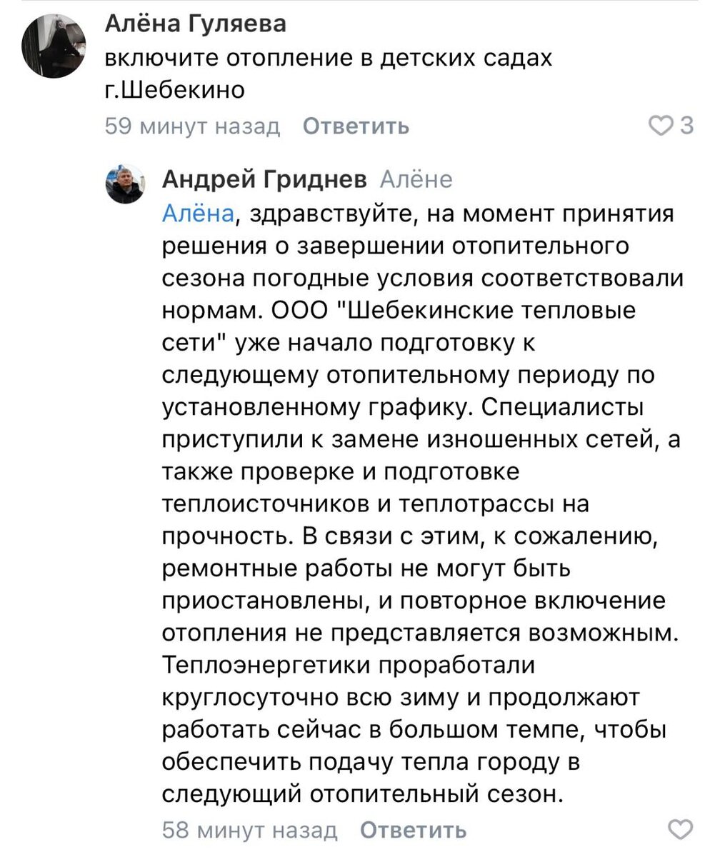 Повторный запуск отопления в Шебекинском округе невозможен из-за начавших ремонтных работ, которые необходимо успеть завершить до начала следующего отопительного сезона.
